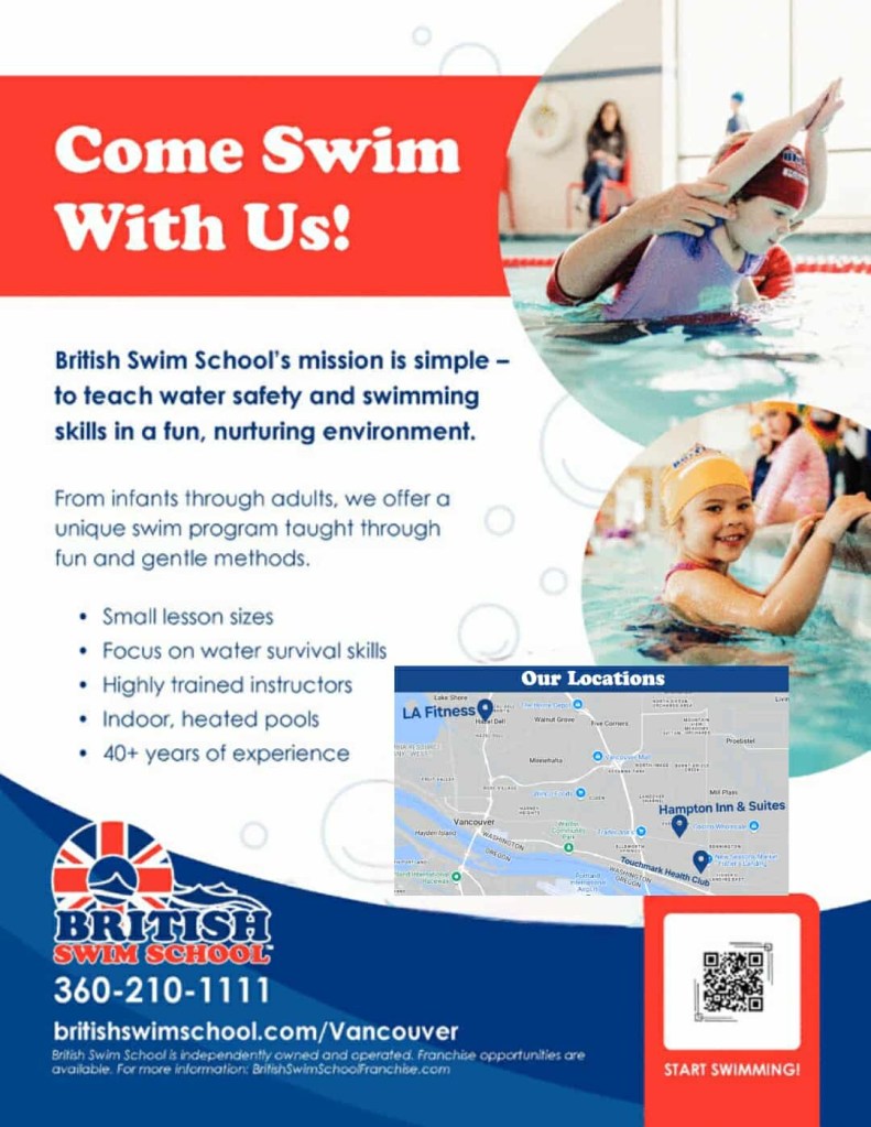 Swimming: Join us at British Swim School Vancouver-South Portland, where learning, fun, and swim safety go hand in hand. For 40 years, swim instructors at British Swim Schools have been teaching water safety and the importance of back floating and survival skills to children as young as 3 months old. We have classes for all ages and abilities. Contact today and mention (Knowledgeseekers PDX) at enrollment to get a discount on a full month of lessons! GoSwimVancouver@BritishSwimSchool.com 360-210-1111 BritishSwimSchool.com/vancouver-south-portland