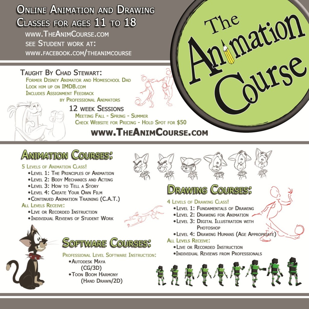 Online animation and drawing classes: homeschool families for ages 11-18? Classes taught by Chad Stewart, former Disney & Sony animator and veteran homeschool dad! Our next session begins on June 2nd for our Summer Session. We also have a Fall Session starting in September! Chad has worked on such films as Tarzan, Emperor’s New Groove and Polar Express and has a wealth of experience to share with your families. Come join the fun! Use Code KSHC-50 to get $50 off. www.theanimcourse.com or email me at Kayla@theanimcourse.com